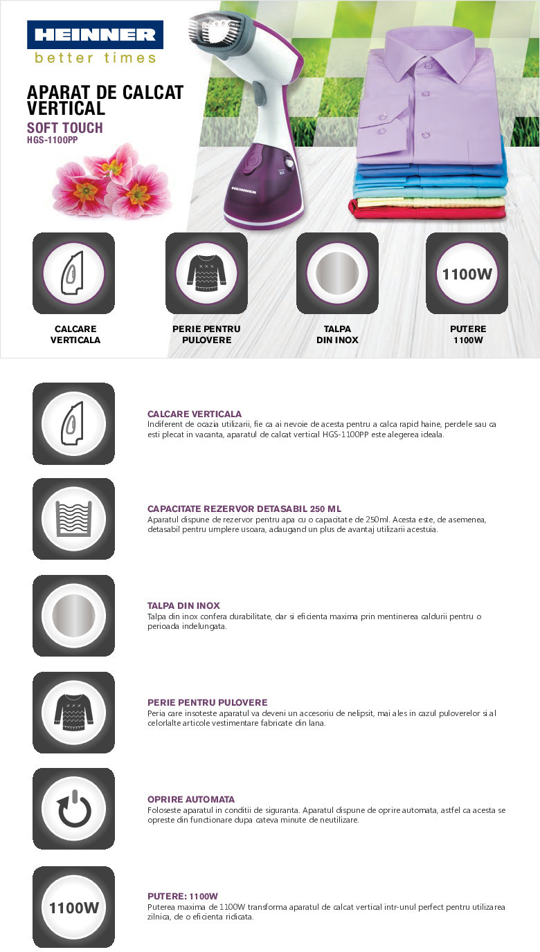 Aparatul de calcat vertical Heinner Soft Touch HGS-1100PP este solutia practica pentru improspatarea rapida a hainelor, fara masa de calcat. Compact, usor de utilizat si eficient, acest model este ideal pentru utilizare zilnica, calatorii sau pentru articole delicate care necesita o ingrijire atenta.