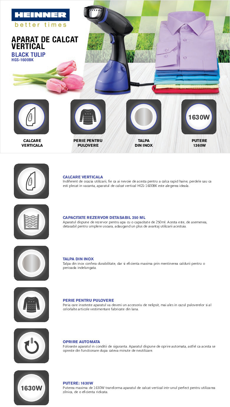 Aparatul de calcat vertical Heinner Black Tulip HGS-1600BK este solutia rapida si eficienta pentru netezirea hainelor, fara masa de calcat. Cu putere ridicata, accesorii utile si un design ergonomic, acest model este ideal pentru utilizare zilnica, acasa sau in calatorii, oferind rezultate vizibile in timp scurt.