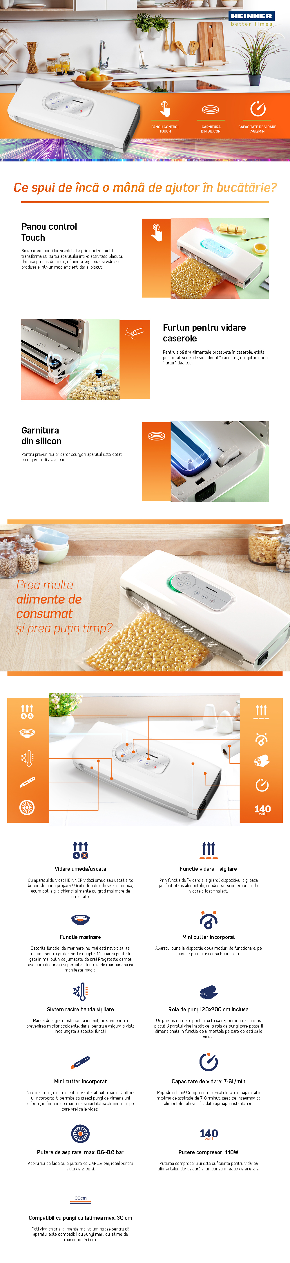 Aparatul de vidat Heinner este ajutorul practic din bucatarie pentru pastrarea alimentelor proaspete mai mult timp. Cu un design compact, control tactil intuitiv si functii esentiale de vidare si sigilare, acest model este ideal pentru utilizare zilnica si pentru reducerea risipei alimentare.