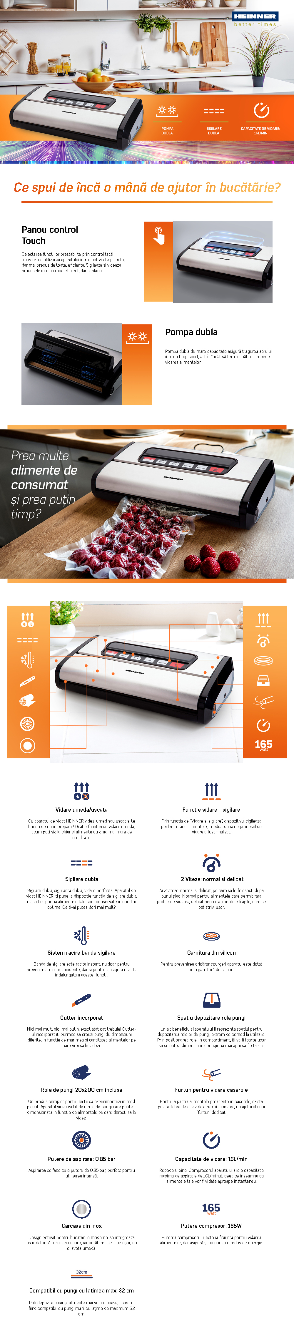 Aparatul de vidat Heinner este ajutorul ideal pentru pastrarea alimentelor proaspete pe termen indelungat, oferind performanta ridicata si control precis. Cu un design elegant din inox, pompa dubla si functii avansate de vidare si sigilare, acest model este perfect pentru o bucatarie moderna si bine organizata.