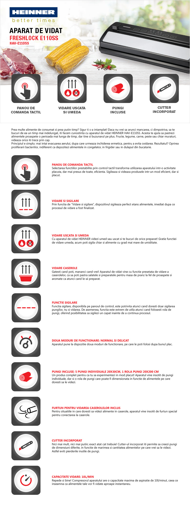 Aparatul de vidat Heinner FreshLock E110SS este solutia eficienta pentru pastrarea prospetimii alimentelor pe termen indelungat. Conceput pentru utilizare usoara si rezultate sigure, acest model combina controlul tactil cu functii versatile de vidare si sigilare, fiind ideal pentru o bucatarie moderna si organizata.