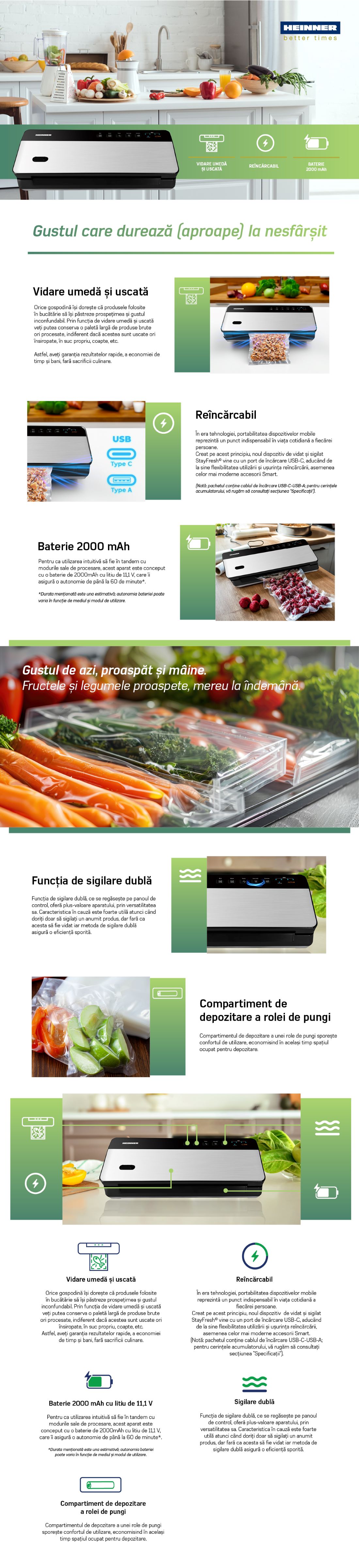 Aparatul de vidat Heinner este solutia moderna pentru pastrarea prospetimii alimentelor pe termen lung. Compact, reincarcabil si usor de utilizat, acest dispozitiv este ideal pentru depozitarea eficienta a alimentelor, reducand risipa si mentinand gustul si textura ingredientelor preferate.