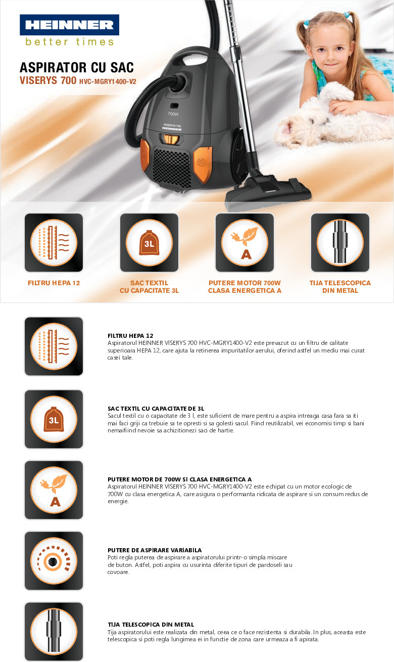 ASPIRATOR CU SAC HEINNER HVC-MGRY1400-V2 - pret cu TVA valabil astazi: 276.53 lei