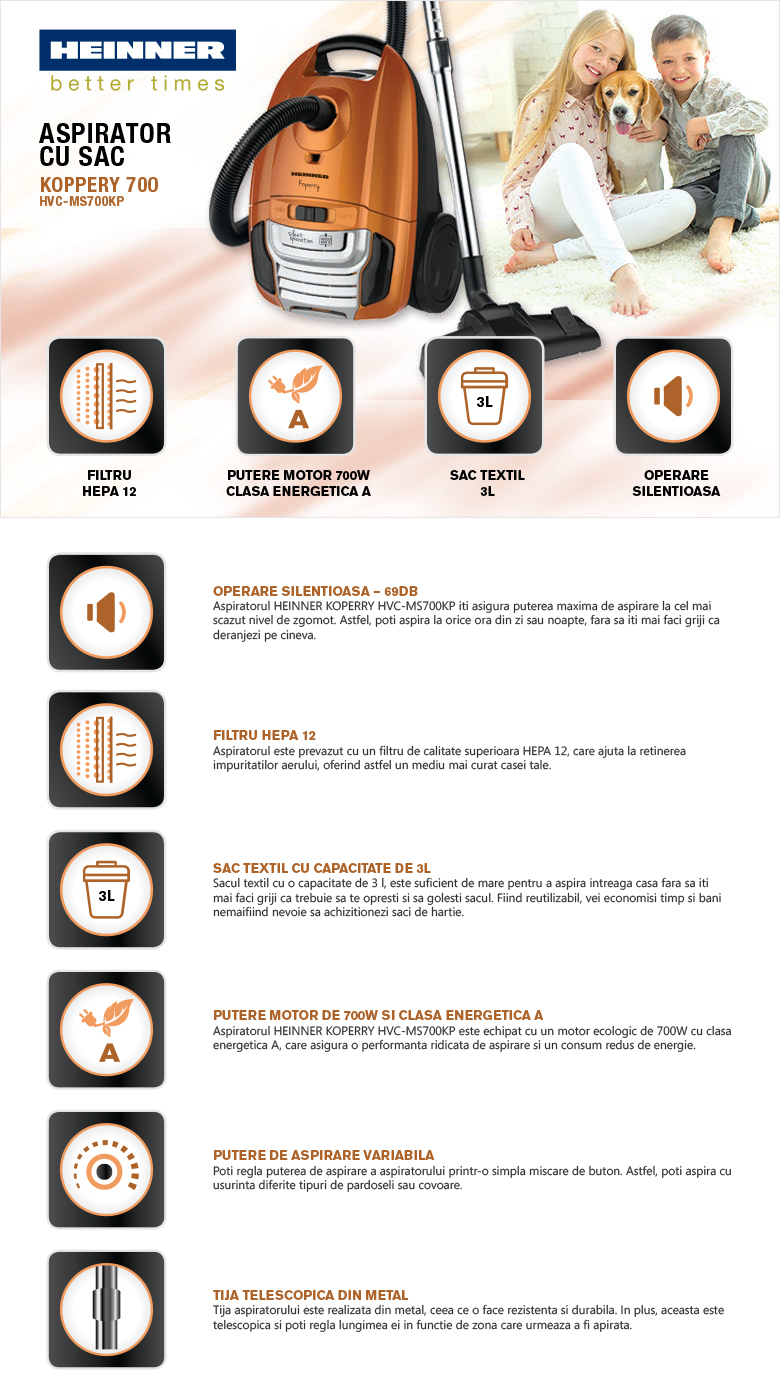 ASPIRATOR CU SAC HEINNER HVC-MS700KP - pret cu TVA valabil astazi: 296.96 lei