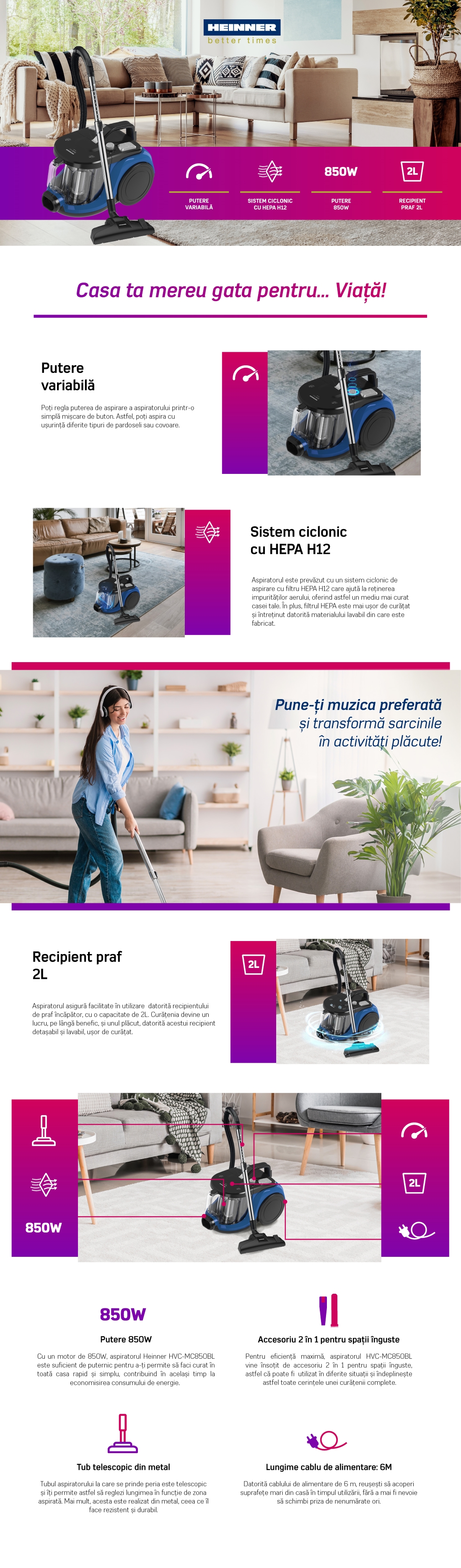 Aspiratorul fara sac Heinner HVC-MC850BL este conceput pentru o curatenie eficienta si confortabila, oferind putere mare de aspirare si un sistem de filtrare performant. Datorita designului modern si functionalitatilor practice, acest model este potrivit pentru utilizare frecventa in orice locuinta.