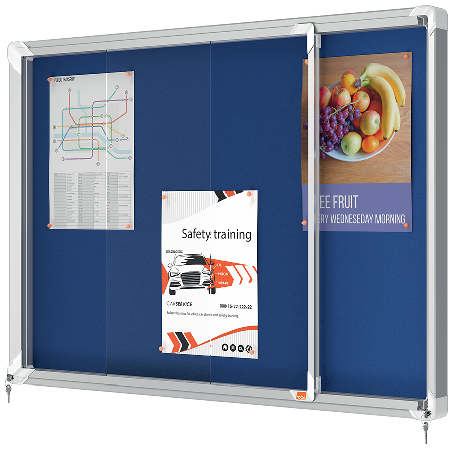 Avizier Nobo din material textil, pentru interior, cu ușă glisantă din sticlă și blocare pe colț.
