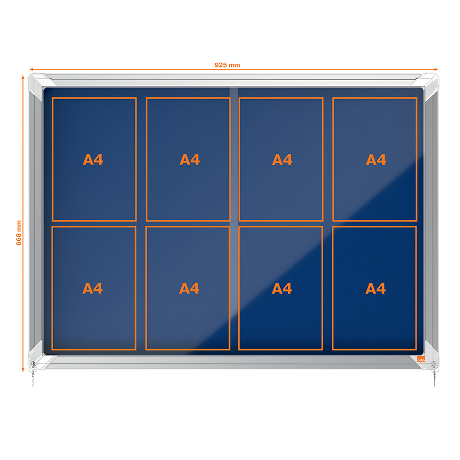 Avizier Nobo din material textil, pentru interior, cu ușă glisantă din sticlă și blocare pe colț. Încadrat într-o ramă de aluminiu cu design modern, ce se fixsează pe perete atât prin colțuri, cât și cu ajutorul unei șine. Suprafață din material textil rezistent, pentru a afișa în siguranță documentele. Dimensiuni: 8xA4