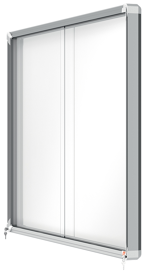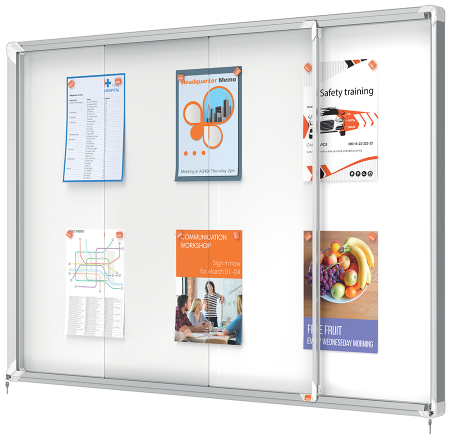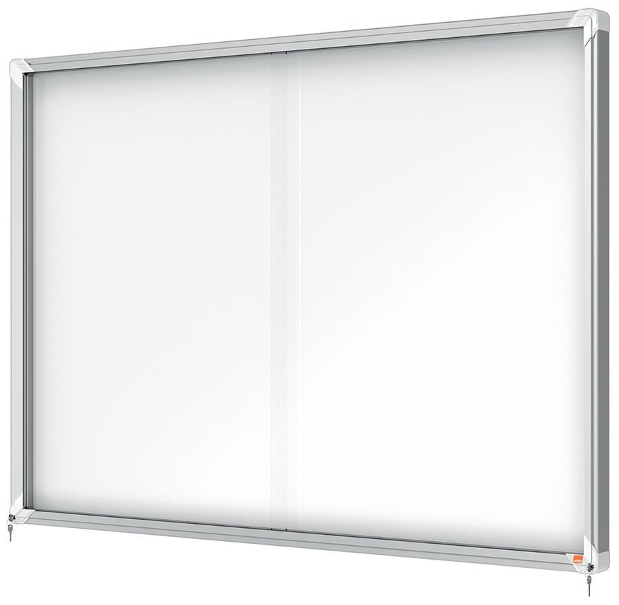 Avizier Nobo magnetic pentru interior, cu ușă glisantă din sticlă și blocare pe colț.