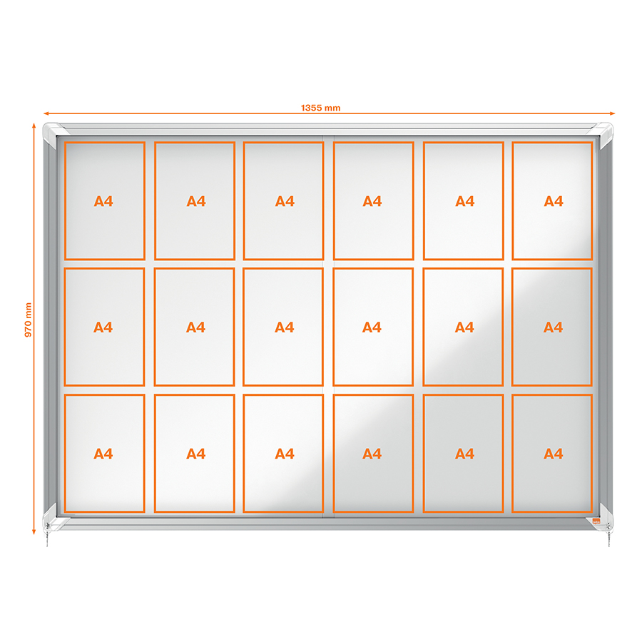 Avizier Nobo magnetic pentru interior, cu ușă glisantă din sticlă și blocare pe colț. Încadrat într-o ramă de aluminiu cu design modern, ce se fixsează pe perete atât prin colțuri, cât și cu ajutorul unei șine. Suprafață din oțel emailat, magnetic, de culoare alb, pentru a afișa în siguranță documentele. Dimensiuni: 18 x A4