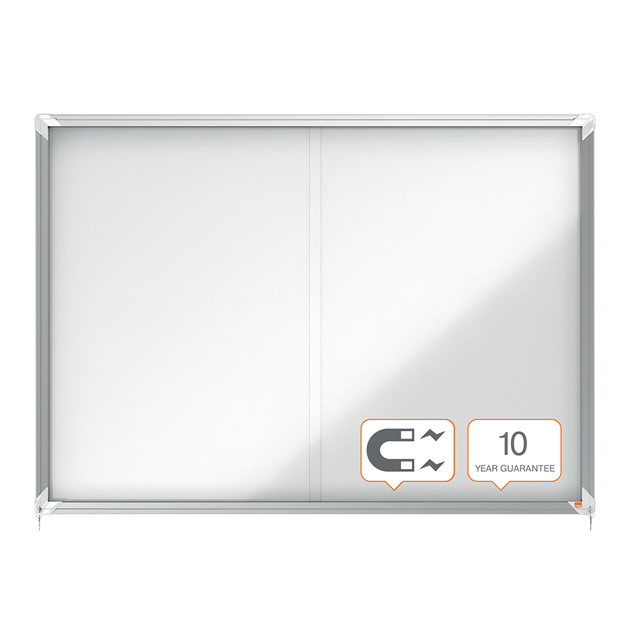Avizier Nobo magnetic pentru interior, cu ușă glisantă din sticlă și blocare pe colț. Încadrat într-o ramă de aluminiu cu design modern, ce se fixsează pe perete atât prin colțuri, cât și cu ajutorul unei șine. Suprafață din oțel emailat, magnetic, de culoare alb, pentru a afișa în siguranță documentele. Dimensiuni: 18xA4