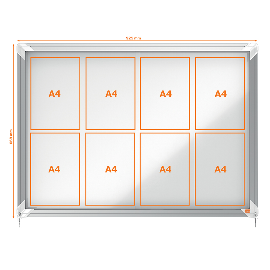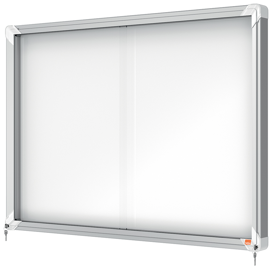 Avizier Nobo magnetic pentru interior, cu ușă glisantă din sticlă și blocare pe colț. Încadrat într-o ramă de aluminiu cu design modern, ce se fixsează pe perete atât prin colțuri, cât și cu ajutorul unei șine. Suprafață din oțel emailat, magnetic, de culoare alb, pentru a afișa în siguranță documentele. Dimensiuni: 8xA4