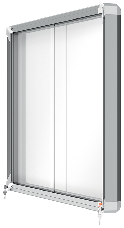Avizier Nobo magnetic pentru interior, cu ușă glisantă din sticlă și blocare pe colț.