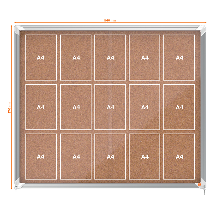 Avizier Nobo din plută, pentru interior, cu ușă glisantă din sticlă și blocare pe colț. Încadrat într-o ramă de aluminiu cu design modern, ce se fixsează pe perete atât prin colțuri, cât și cu ajutorul unei șine. Suprafață din plută rezistentă, pentru a afișa în siguranță documentele. Dimensiuni: 15 x A4