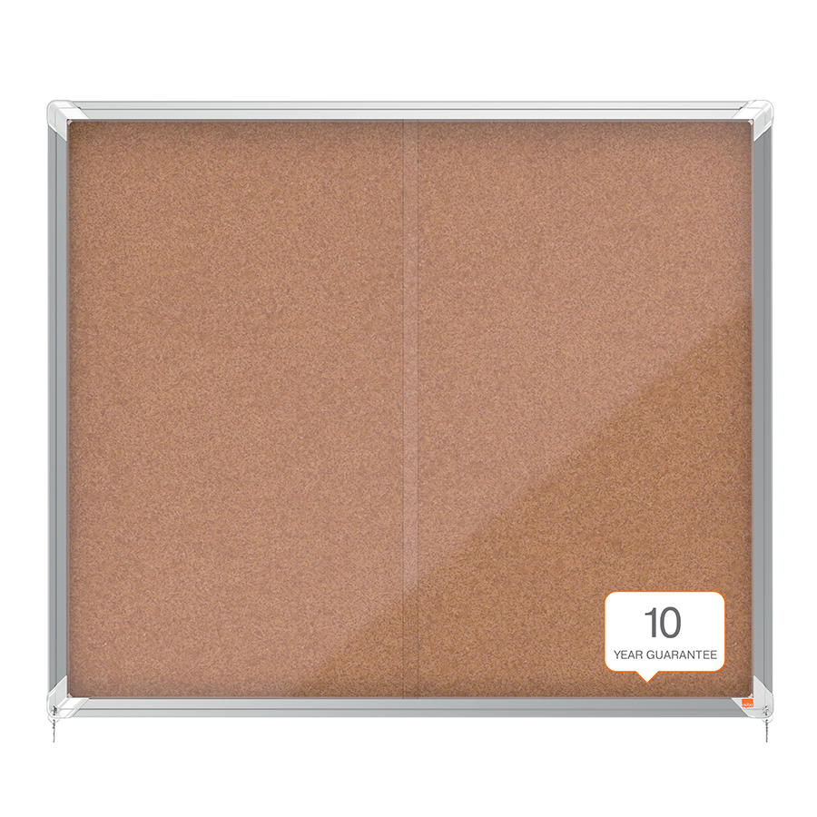 Avizier Nobo din plută, pentru interior, cu ușă glisantă din sticlă și blocare pe colț.