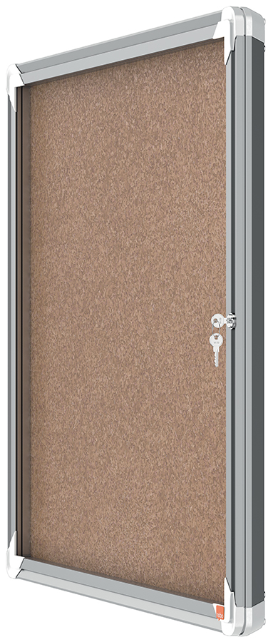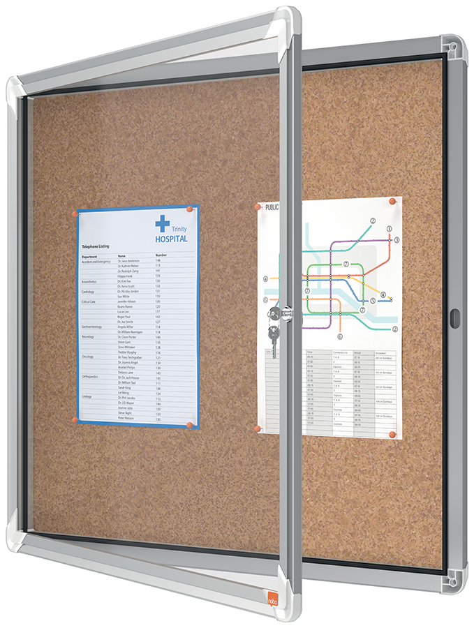 Avizier Nobo din plută, pentru interior, cu ușa din sticlă și blocare laterală. Încadrat într-o ramă de aluminiu cu design modern, ce se fixsează pe perete prin colțuri. Suprafață din plută rezistentă, pentru a afișa în siguranță documentele. Dimensiuni: 8xA4