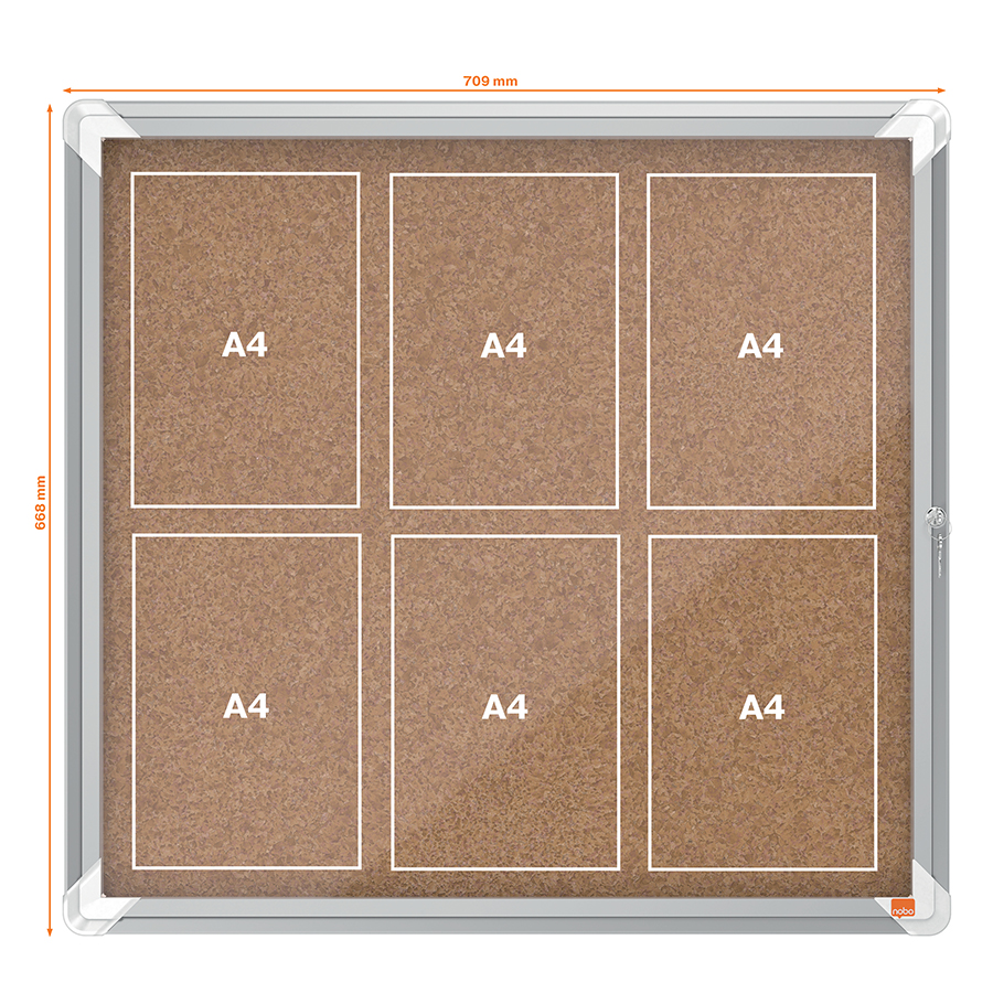 Avizier Nobo din plută, cu carcasă pentru interior, sticlă securizată de 4mm grosime, pentru mai multă siguranță. Perfect pentru afișarea documentelor în siguranță. Optimizat pentru mai multe documente A4. Accesoriile pentru montarea pe perete sunt incluse, cât și două chei pentru blocare. 6XA4, 752x692x37mm - dimensiuni exterioare.