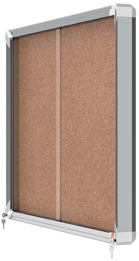 Avizier Nobo din plută, pentru interior, cu ușă glisantă din sticlă și blocare pe colț.