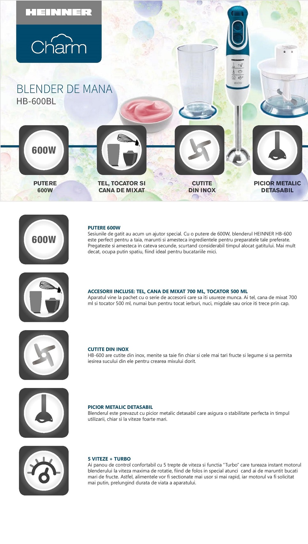 Blender de mana Heinner Charm HB-600BL, multifunctional: tocator, tel sicana de mixat, putere: 600W, 2 viteze + turbo, capacitate cana: 700 ml,capacitate tocator: 500 ml, picior blender metalic detasabil, cutite deinox, suport perete, culoare: albastru.