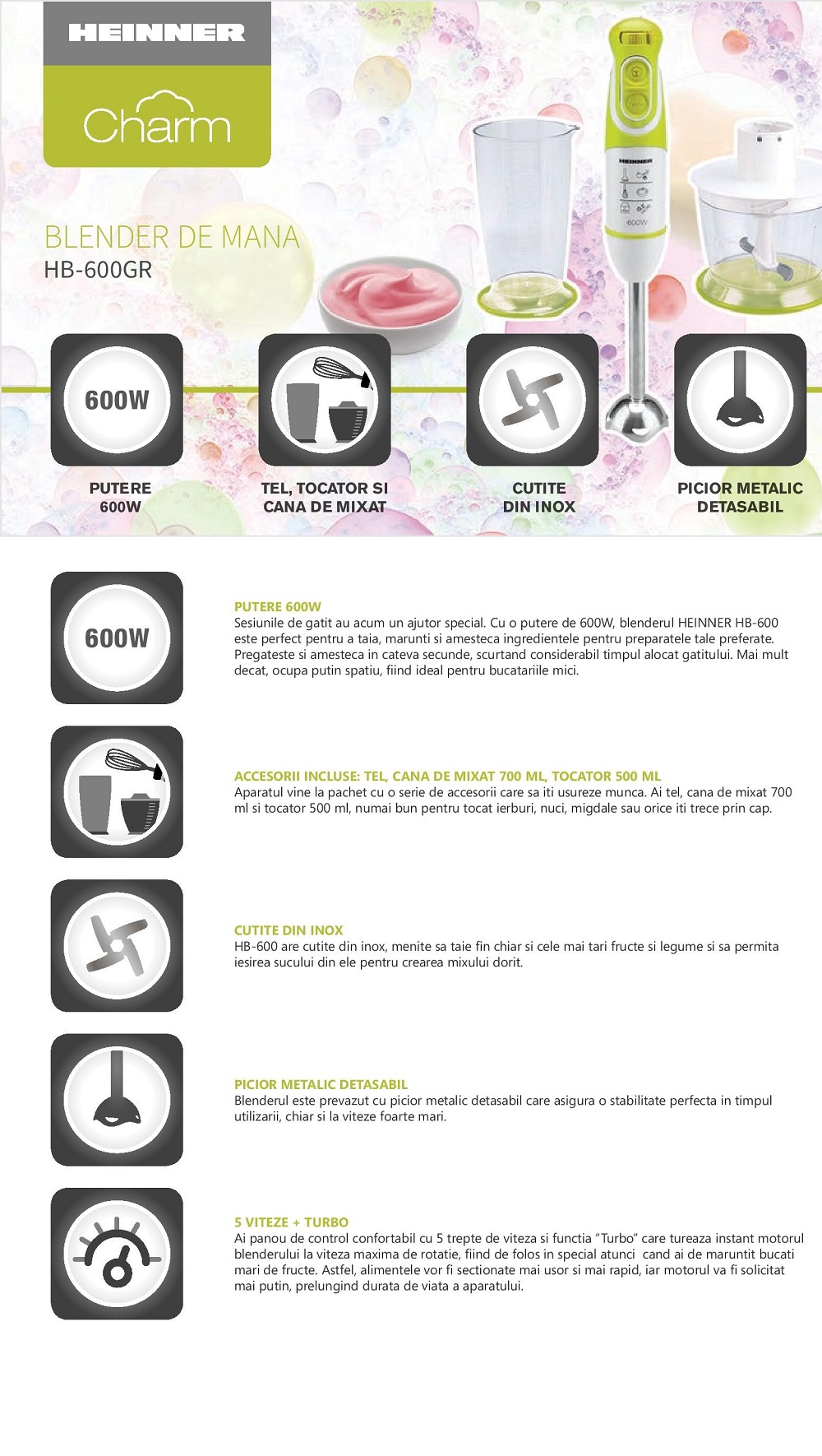 BLENDER DE MANA HEINNER CHARM HB-600GR - pret cu TVA valabil astazi: 97.54 lei