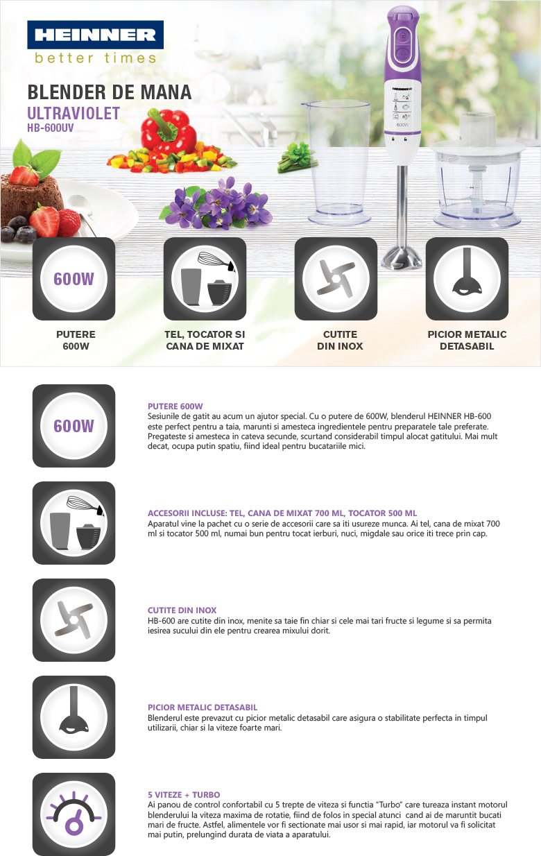 Blender de mana Heinner HB-600UV, multifunctional: tocator, tel si cana de mixat, putere: 600W, 5 viteze + turbo, capacitate cana: 700 ml, capacitate tocator: 500 ml, picior blender metalic detasabil, cutit de inox, culoare: ultraviolet.