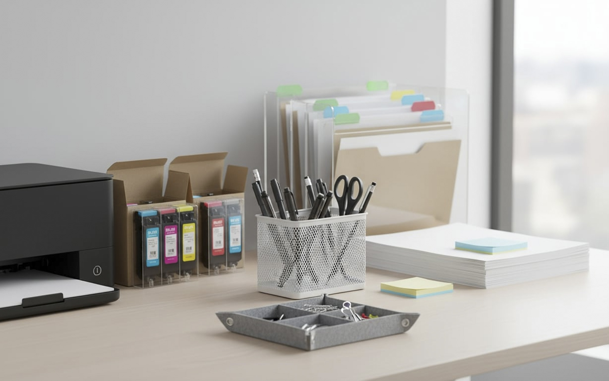 - Verifici stocul inițial: Faci o inventariere rapidă a tot ce ai deja în birou. Notezi cantitățile și identifici produsele care sunt aproape să se termine.