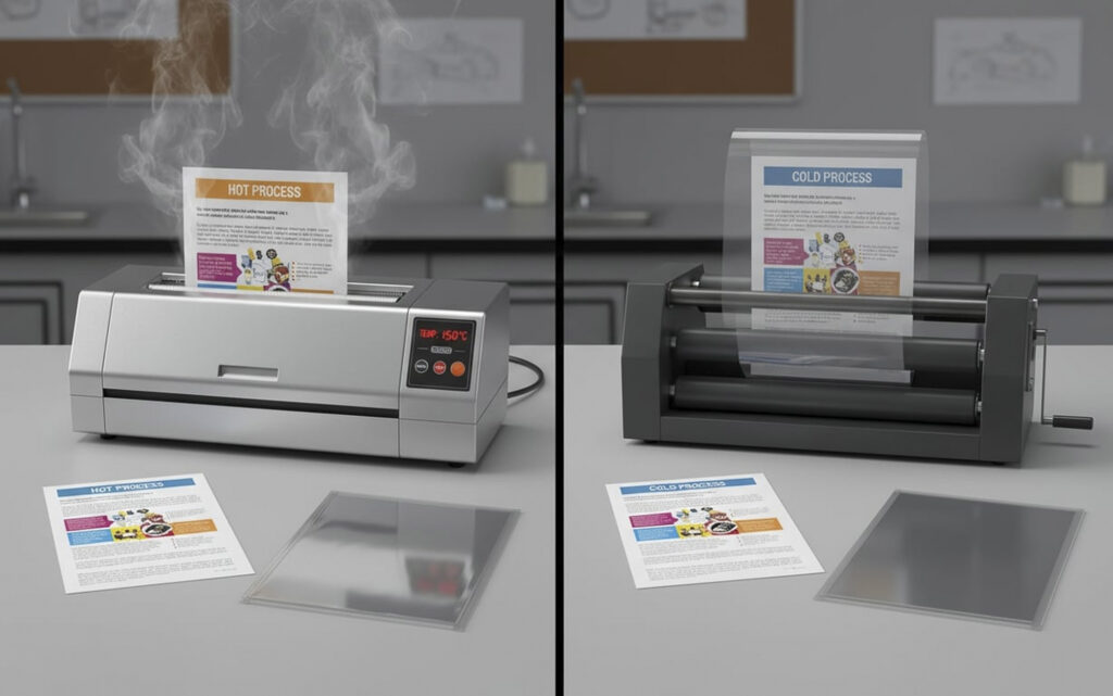 Diferența cheie stă în adeziv: laminarea la cald folosește temperatura pentru o fixare permanentă, iar laminarea la rece folosește presiunea pentru folii autoadezive, fiind ideală pentru materialele sensibile.