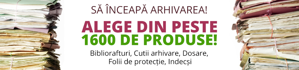 Ianuarie – luna arhivariiBy Oana Epure / ianuarie 2, 2016 Luna ianuarie este luna arhivarii. De aceea, am pregatit pentru voi toate produsele de care aveti nevoie pentru a va putea organiza documentele adunate in timpul anului. Mare lor majoritate sunt in stoc si le putem livra in cel mai scurt timp!