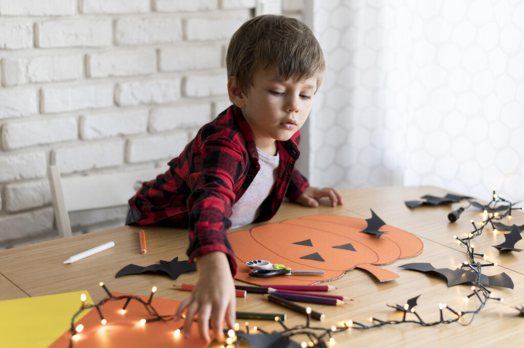 Băiat care lucrează la un dovleac decupat din carton pentru Halloween