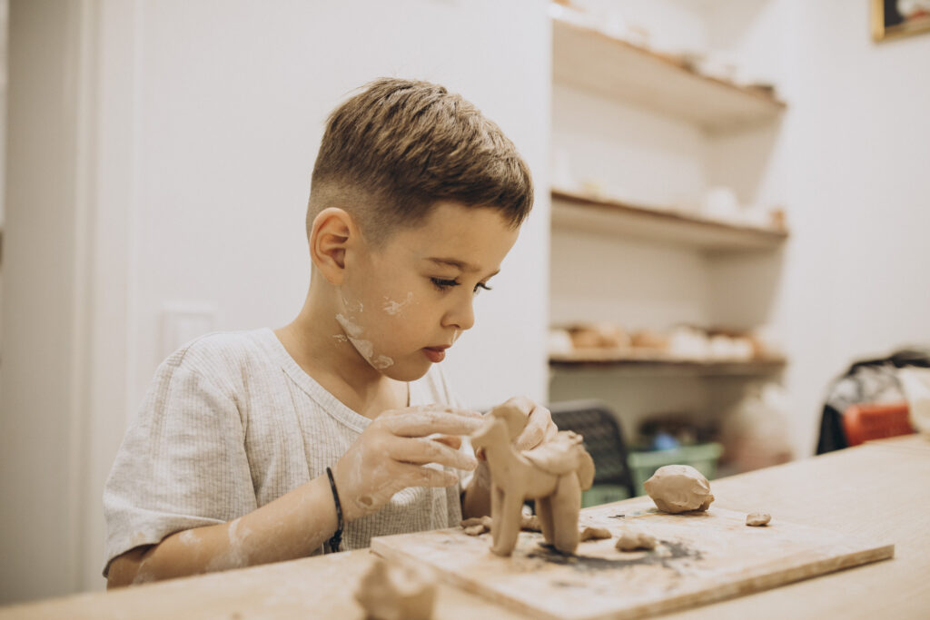 Băiat care modelează un cal din plastilină