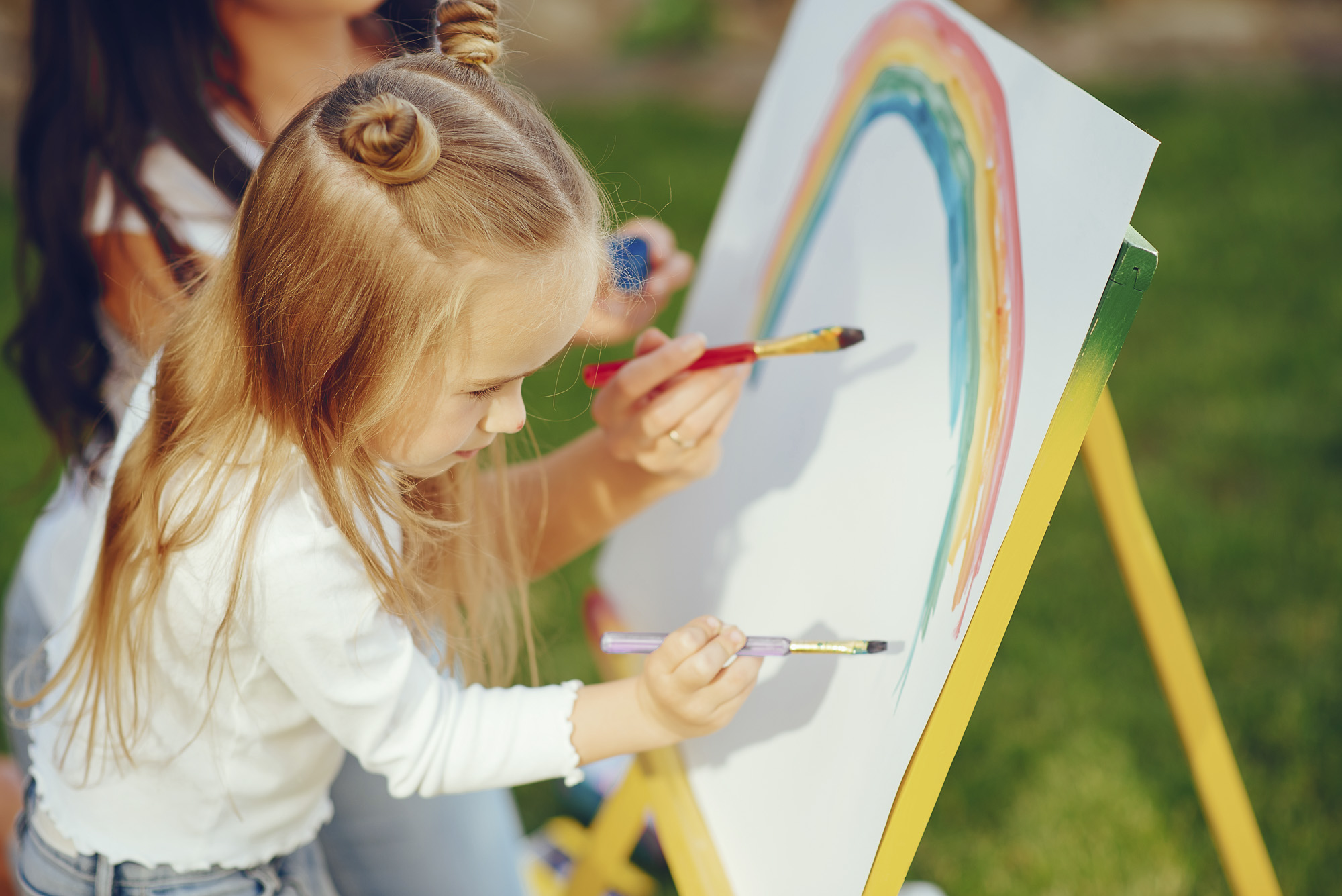 Fetiță care pictează alături de mamă