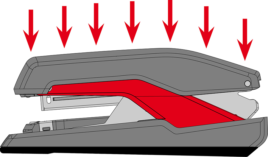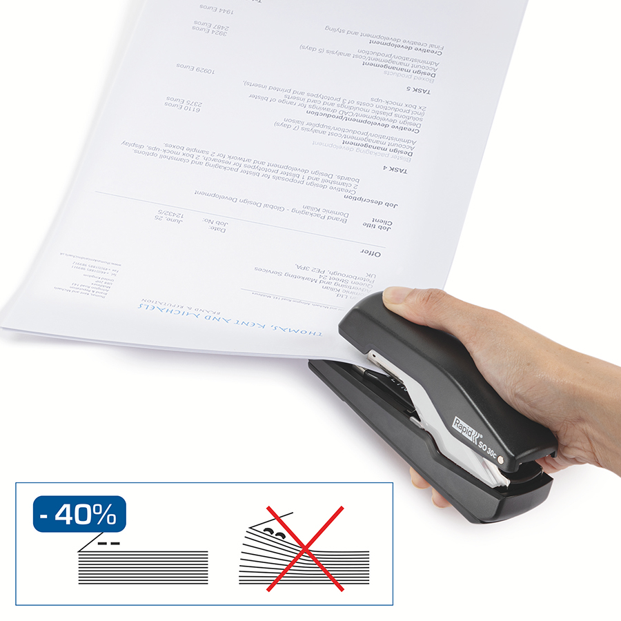 Capsator revoluționar, echipat cu tehnologia patentată Omnipress pentru reducerea efortului atât la capsarea pe birou, cât și în mână. Tehnologia unică SuperFlatClinch reduce volumul documentelor capsate cu până la 40%.