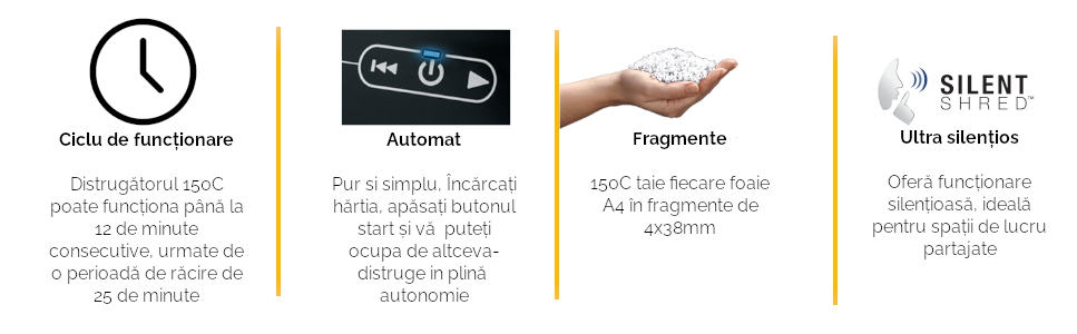Distruge până la 150 de coli automate și 8 coli manual timp de 12 minute, permițând ca lucrările dvs. de mărunțire să fie completate într-o singură ședință