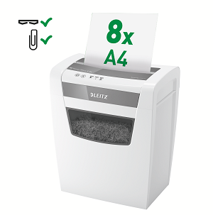 Distrugator documente manual Leitz IQ Home Office, P4, micro-cut (particule), 8 coli, cos 15l, alb-gri - pret cu TVA valabil astazi: 549.99 lei