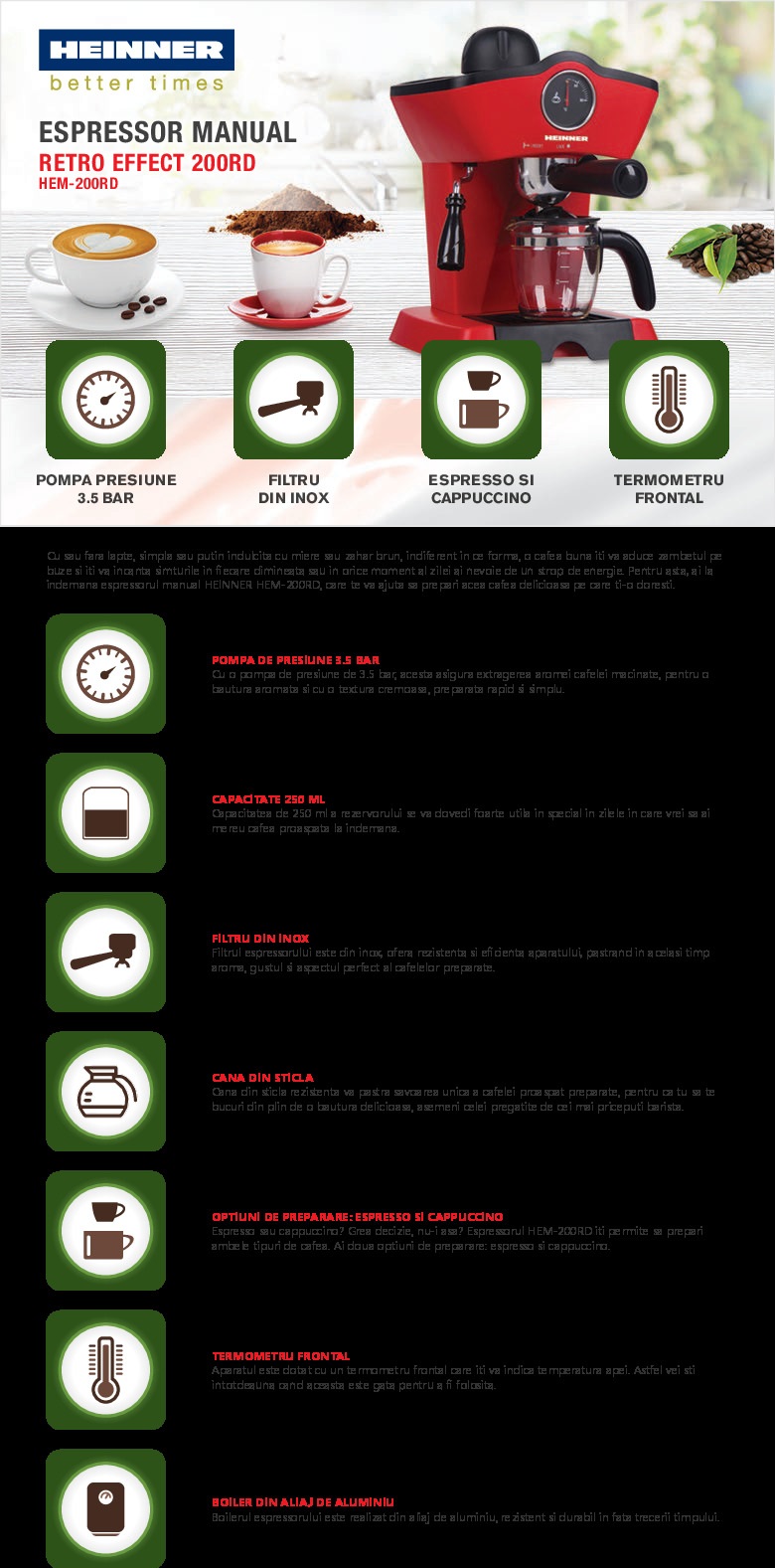 Espressor Heinner Retro Effect HEM-200RD rosu - pret cu TVA valabil astazi: 196.47 lei