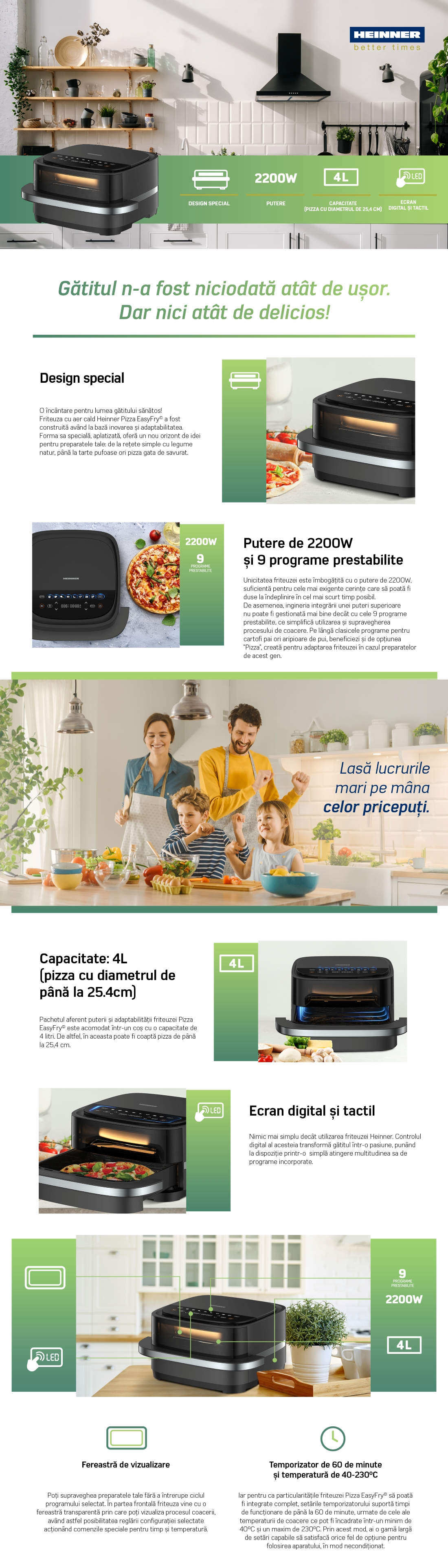 Friteuza cu aer cald Heinner Pizza EasyFry este conceputa pentru gatit rapid, sanatos si delicios, fara ulei sau cu un consum minim. Cu un design special, capacitate generoasa si control digital avansat, acest aparat transforma fiecare masa intr-o experienta simpla si savuroasa, potrivita pentru intreaga familie.