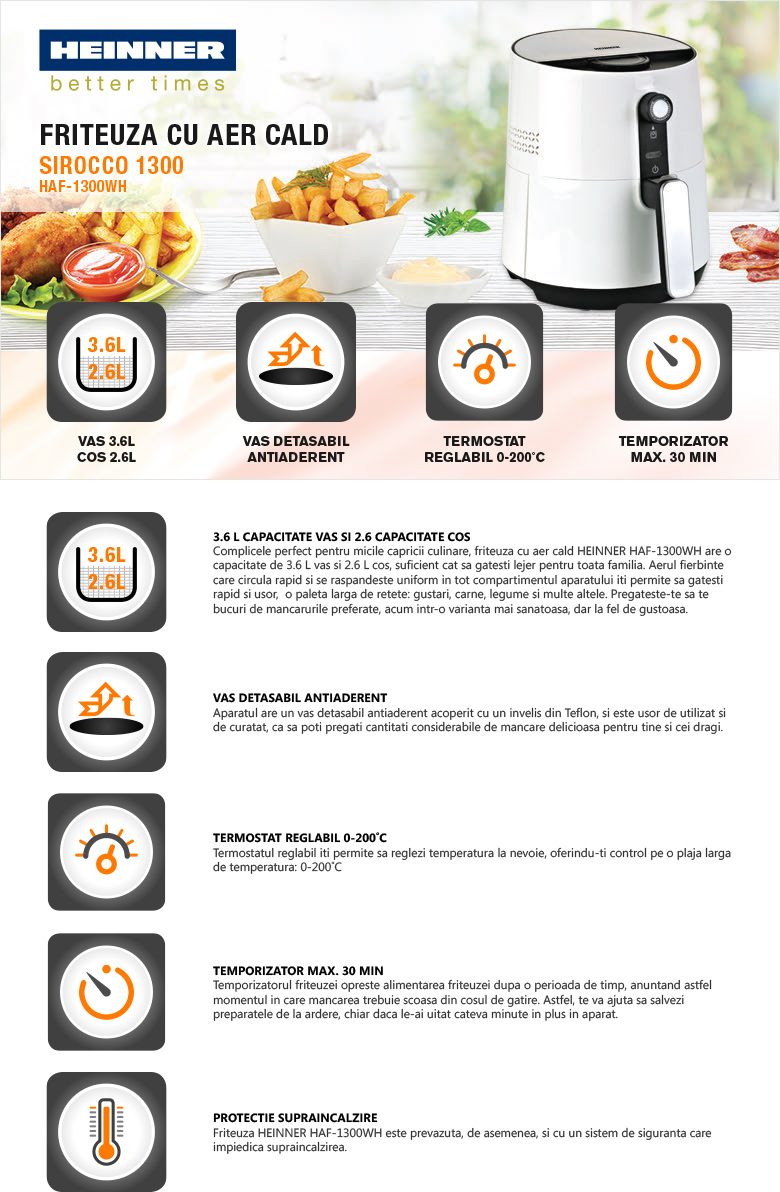 Friteuza cu aer cald Heinner HAF-1300WH, capacitate totala vas: 3.6L, vas antiaderent, caapcitate cos: 2.6L, termostat reglabil: 0-200 grade C, timer max: 30 min, maner rece, protectie supraincalzire, putere: 1300W.