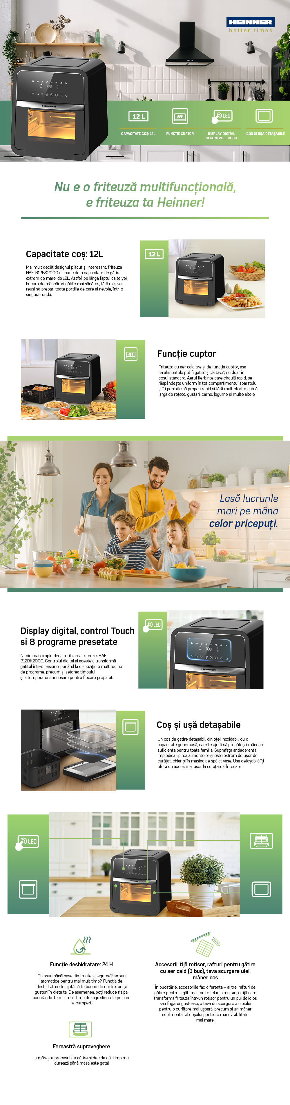 Friteuza cu aer cald HEINNER MASTERFRY HAF-B12BK2000, 2000W, functie cuptor, capacitate: 12l, display digital cu control touch, timer 60 min, deshidratare 24h, temperatura 30-200 grade, 8 programe presetate, 3 nivele de gatire, cos gatire cu aer cald, tija rotisor, rafturi pentru gatire cu aer cald, 3 buc, tava scurgere ulei, maner cos, usa detasabila pentru curatare usoara, oprire automata, negru.