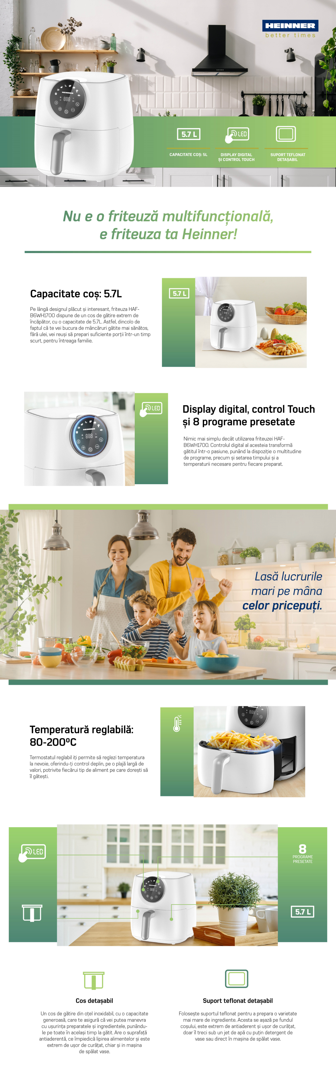 Friteuza cu aer cald Heinner SmartFry HAF-B6WH1700, putere: 1700W, capacitate: 5.7L, display digital cu control tactil, timer 60 min, temperatura 80- 200°C, 8 programe presetate, cos detasabil, oprire automata, picioruse anti-alunecare, alb.