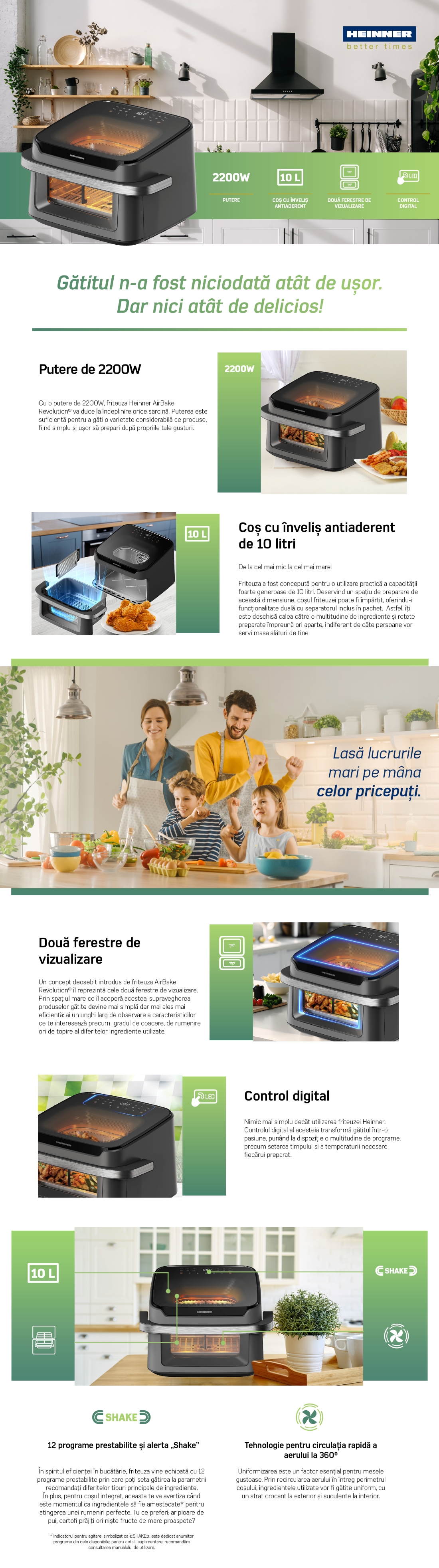 Friteuza cu aer cald Heinner AirBake Revolution este conceputa pentru gatit rapid, uniform si sanatos, fiind ideala pentru familii numeroase sau pentru preparate voluminoase. Cu o capacitate foarte mare, putere ridicata si functii avansate, acest aparat transforma gatitul zilnic intr-o experienta simpla si eficienta.