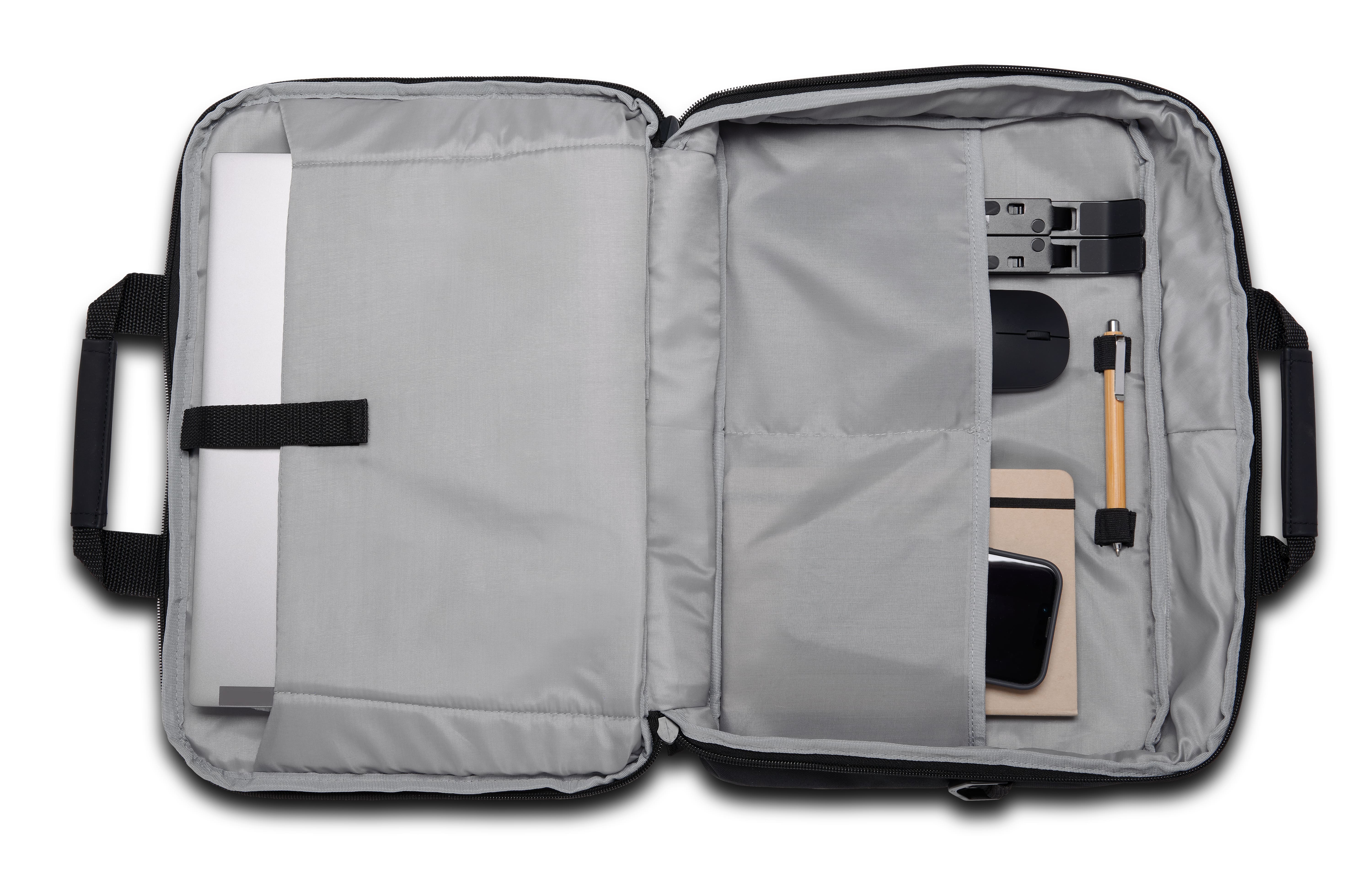 Include un compartiment intern căptușit pentru laptopuri de până la 16„ (inclusiv notebook-uri de 15,6”), un compartiment frontal cu fermoar pentru acces rapid la elementele esențiale și mai multe buzunare pentru dosare și accesorii.