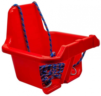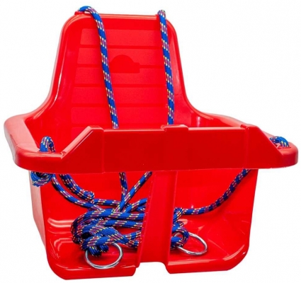 Leaganul realizat din material plastic (polipropilena) viu colorat are spatar, opritor antialunecare si 2 corzi cu prindere de leagan in 4 puncte.