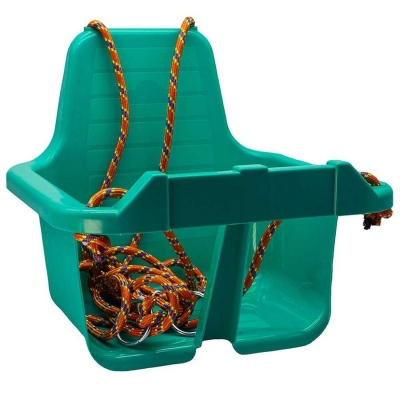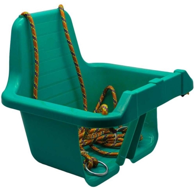 Leaganul realizat din material plastic (polipropilena) viu colorat are spatar, opritor antialunecare si 2 corzi cu prindere de leagan in 4 puncte.