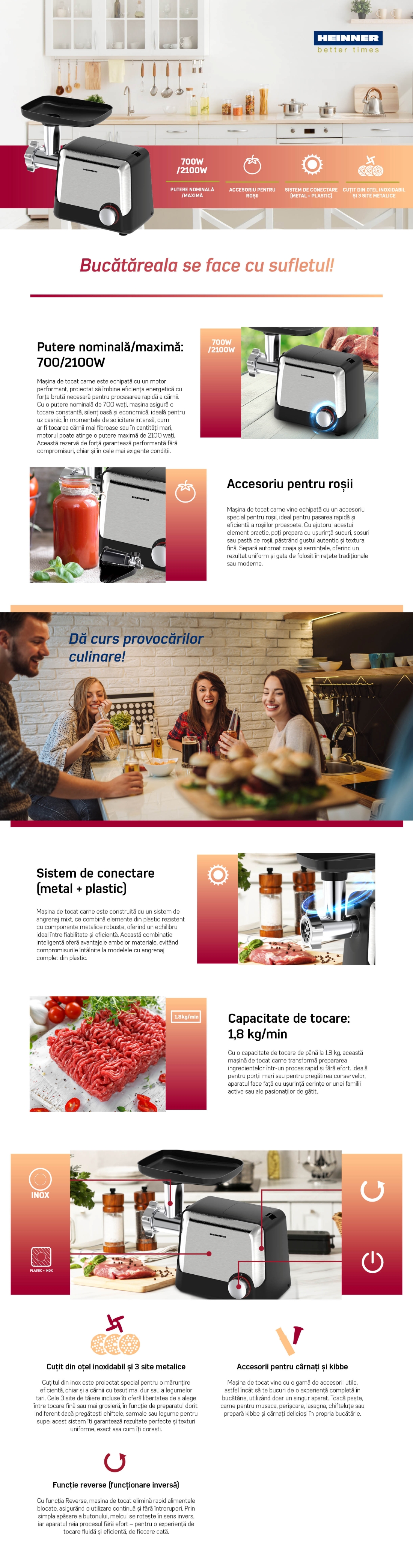 Masina de tocat carne Heinner este un ajutor de nadejde in orice bucatarie, conceputa pentru a face fata cu usurinta provocarilor culinare zilnice. Cu un design modern si o constructie robusta, acest aparat imbina eficienta, siguranta si versatilitatea, fiind ideal pentru prepararea rapida a diferitelor tipuri de carne si legume.