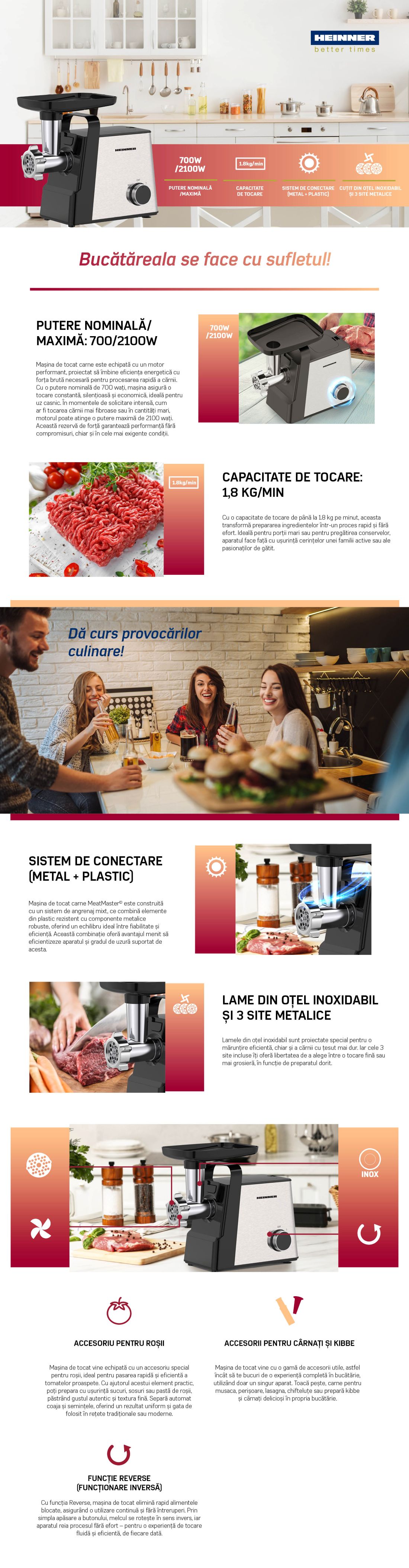 Masina de tocat carne Heinner este conceputa pentru utilizare zilnica, oferind un echilibru excelent intre putere, fiabilitate si usurinta in utilizare. Cu un design modern si constructie solida, acest aparat este ideal pentru prepararea rapida a carnii tocate, sosurilor si retetelor traditionale, direct in bucataria ta.