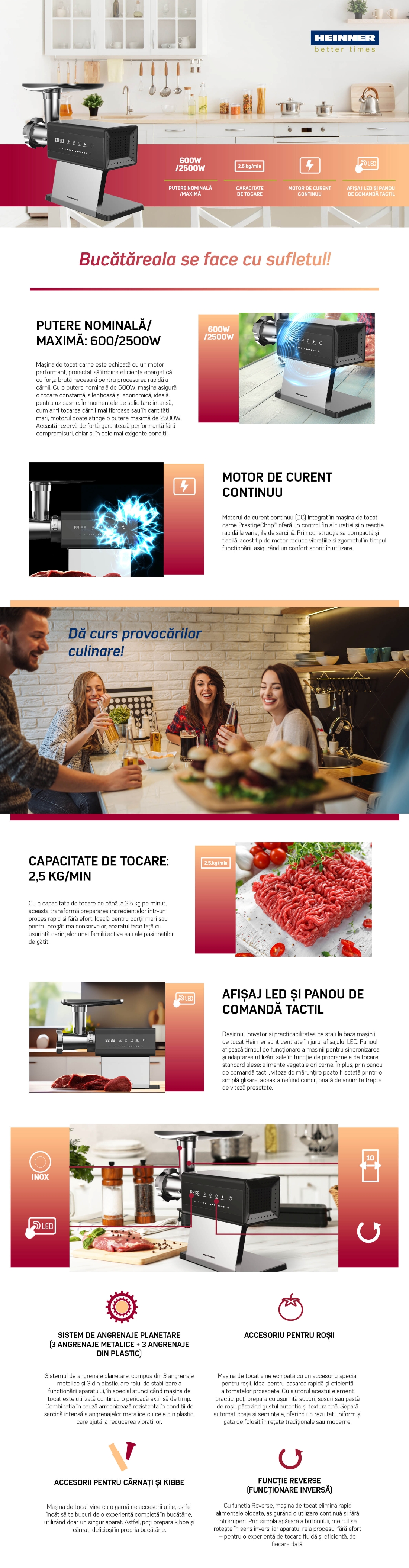 Masina de tocat carne Heinner este conceputa pentru performanta ridicata si control avansat in bucatarie. Cu un design modern, stabilitate excelenta si tehnologii inteligente, acest model este ideal pentru utilizatorii care doresc putere, precizie si versatilitate intr-un singur aparat.