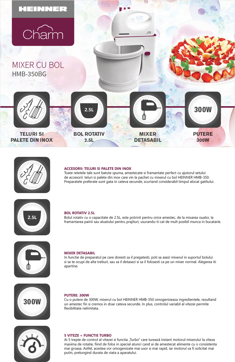 Mixer cu bol Heinner Charm HMB-350BG, putere: 300W, 5 viteze+turbo, bol rotativ: 2.5 l, accesorii: 2 teluri + 2 carlige pentru framantare, buton ejector cu dispozitiv de siguranta, buton eliberare mixer de mana.