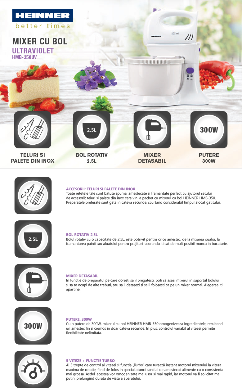 Mixer cu bol Heinner HMB-350UV, putere: 300W, 5 viteze+turbo, bol rotativ: 2.5 l, accesorii din inox: 2 teluri + 2 carlige pentru framantare, buton ejector cu dispozitiv de siguranta, buton eliberare mixer de mana, culoare: violet.