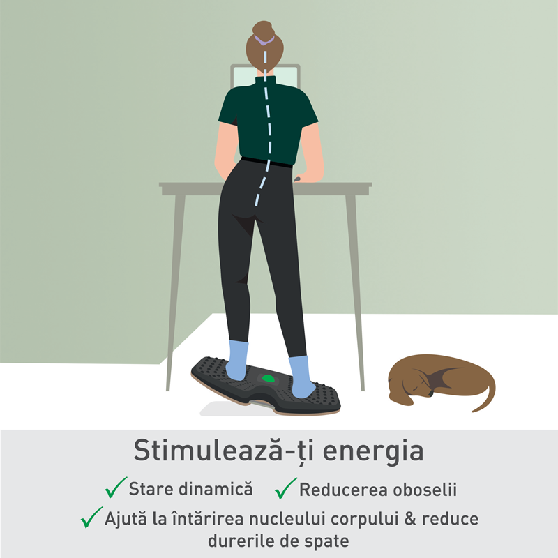 - Creează micro-mișcări naturale care activează mușchii trunchiului și picioarelor, îmbunătățind postura și reducând durerile de spate.