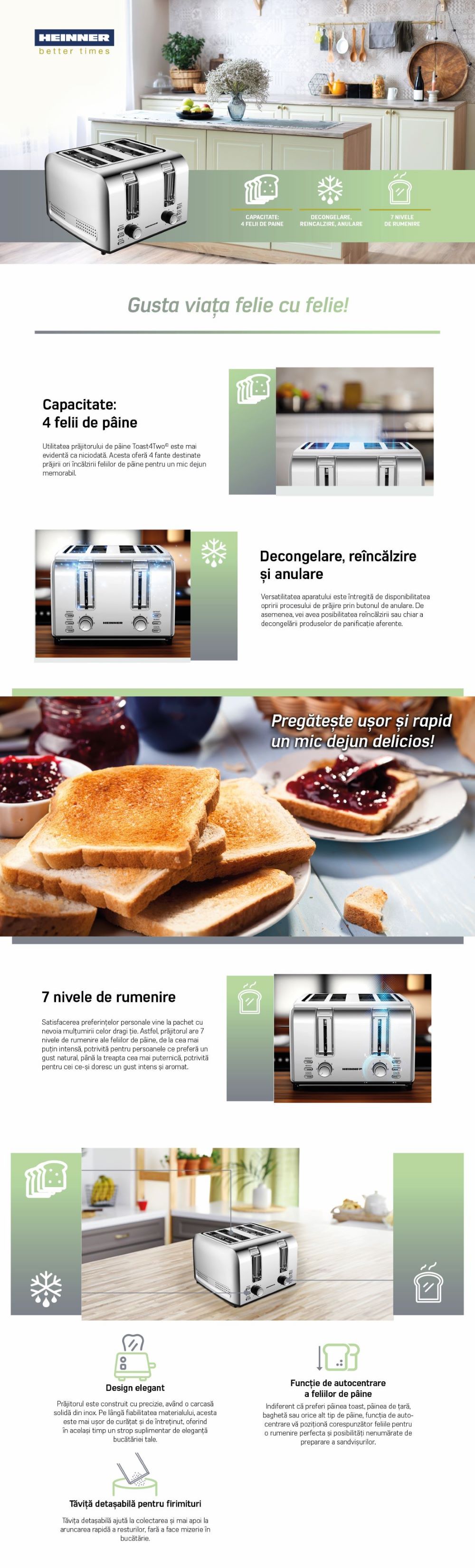 PRAJITOR DE PAINE HEINNER HTP-4S1500SS, 1500W, CAPACITATE: 4 FELII, 7 NIVELURI DE RUMENIRE, FUNCTII: REINCALZIRE, DECONGELARE, ANULARE, CARCASA INOX.