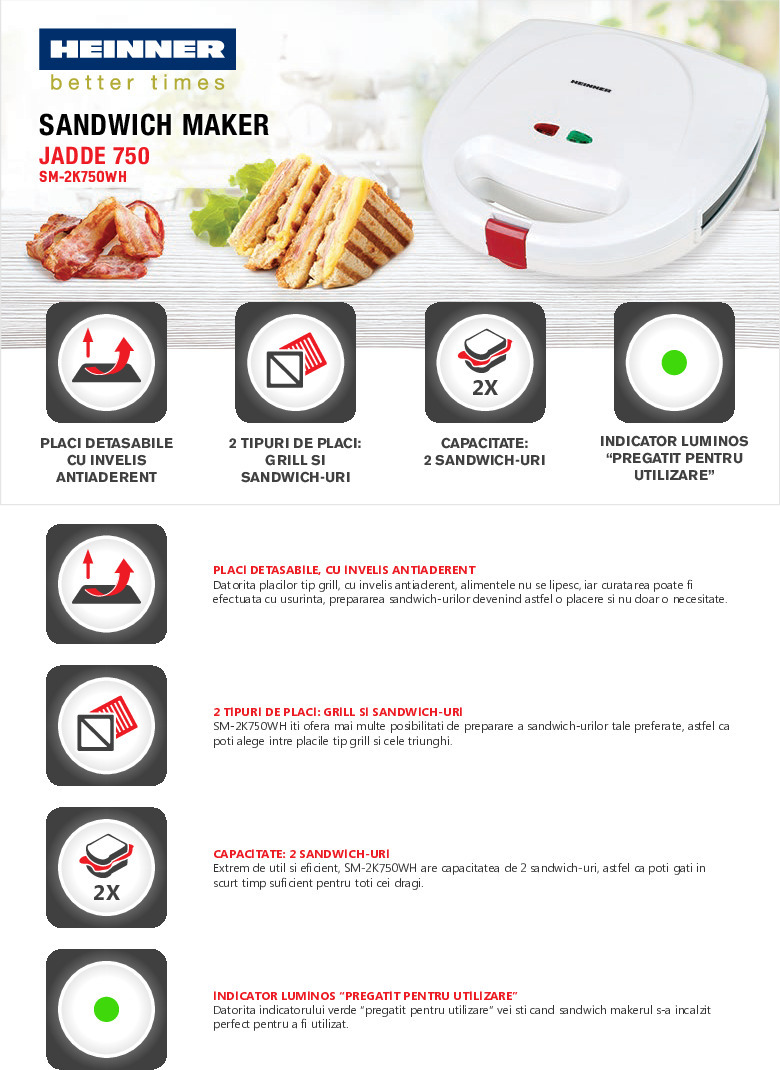 SANDWICH MAKER HEINNER SM-2K750WH - pret cu TVA valabil astazi: 72.22 lei